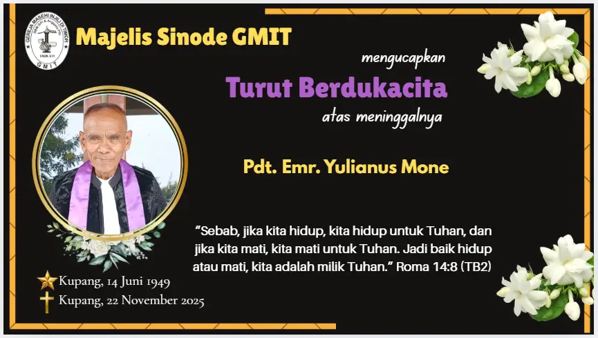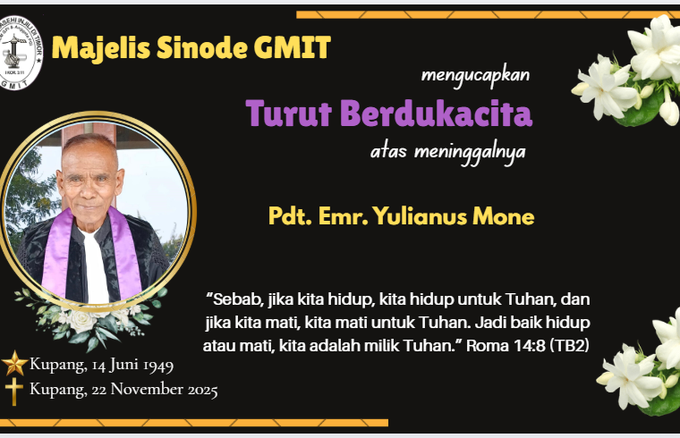 BERITA GMITNovember 24, 2025Turut Berdukacita: Pdt. Emr. Julianus Mone Share this:Post Related postsYAO GMIT Panen Padi Organik,…Mitigasi Krisis Domestik, Majelis Sinode…KEBANGKITAN YANG MEMBERI PENGHARAPAN (1…Tujuh Tahun Mengabdi, Pdt. Sherli…Proklamasi Kebangkitan Kristus: Ribuan Pemuda…Bertolenes Haki Pimpin SD GMIT…Emeritasi Pdt. Gidion Awola: 26…Setia Hingga Akhir, Pdt. Petrus…Diyakinkan untuk Memberitakan Pertobatan dan…Pawai Pembangunan dan Paskah 2026…